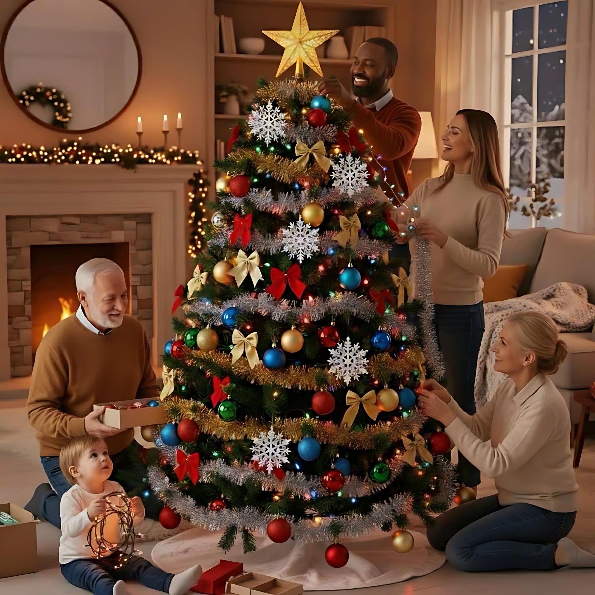 Disponible avec ou sans sapin de 1m80 (au choix) ! Il garantit une décoration riche, harmonieuse et entièrement personnalisée. Il comprend 96 Boules assorties, 2 Guirlandes décoratives (20m), 1 Guirlande lumineuse LED (20m), 1 Jupe de sapin, et 1 Étoile de cime, 6 superbes Nœuds et 36 Flocons décoratifs.🎄